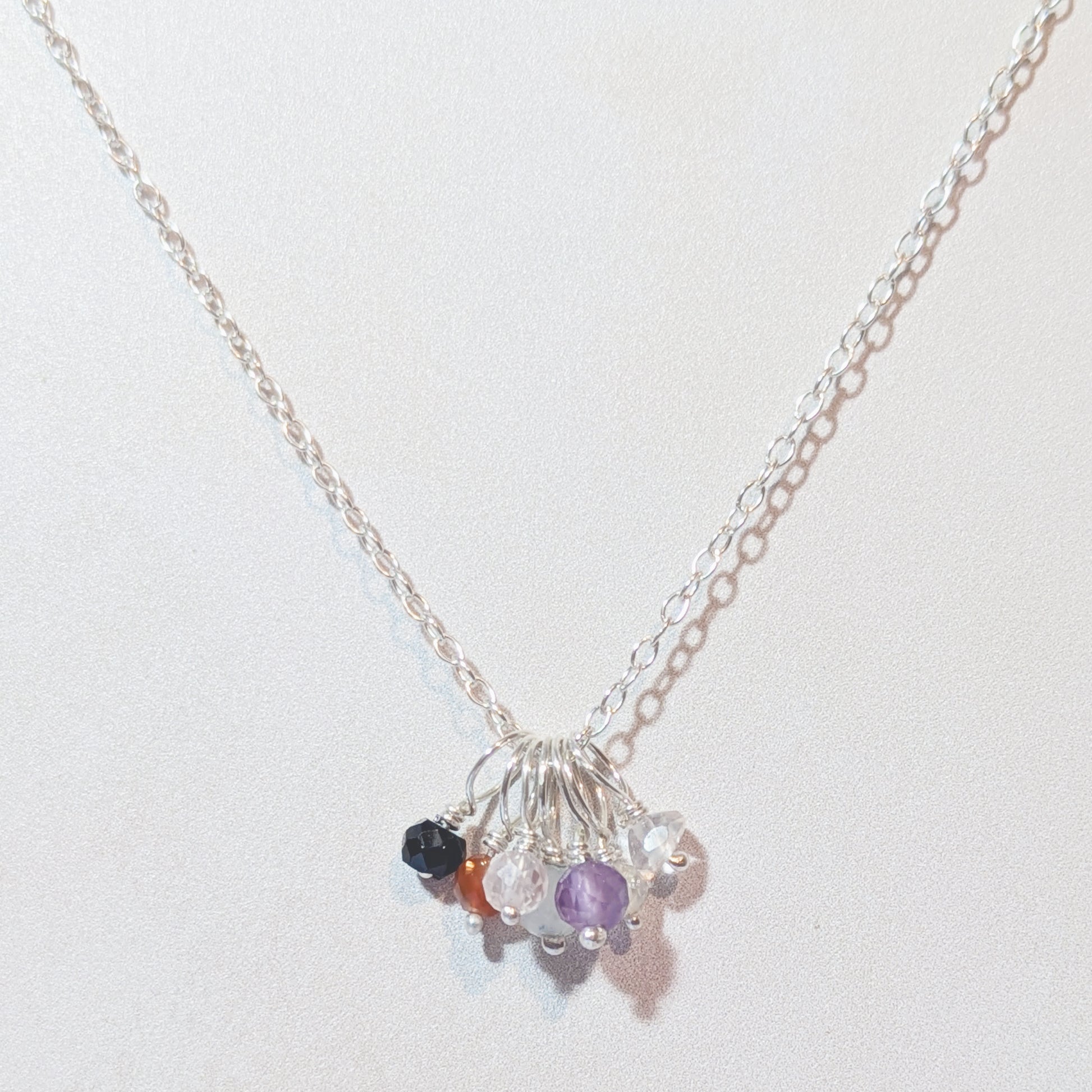 Chakras (Sanskrit for ‘wheel’) are energy centres within the body. When aligned, they encourage a sense of calm and centring. This necklace represents the complete cycle using specific gemstones for each energy centre: