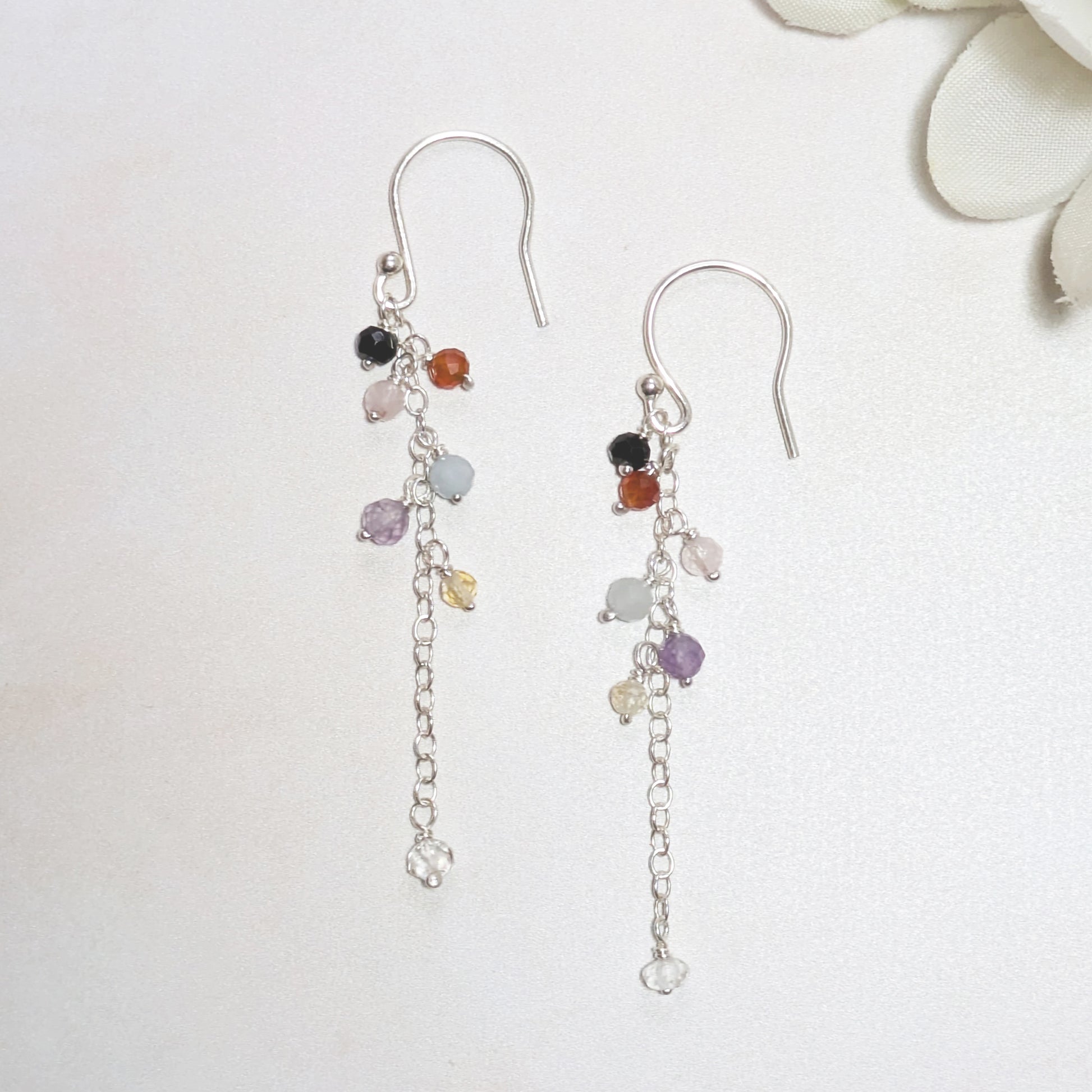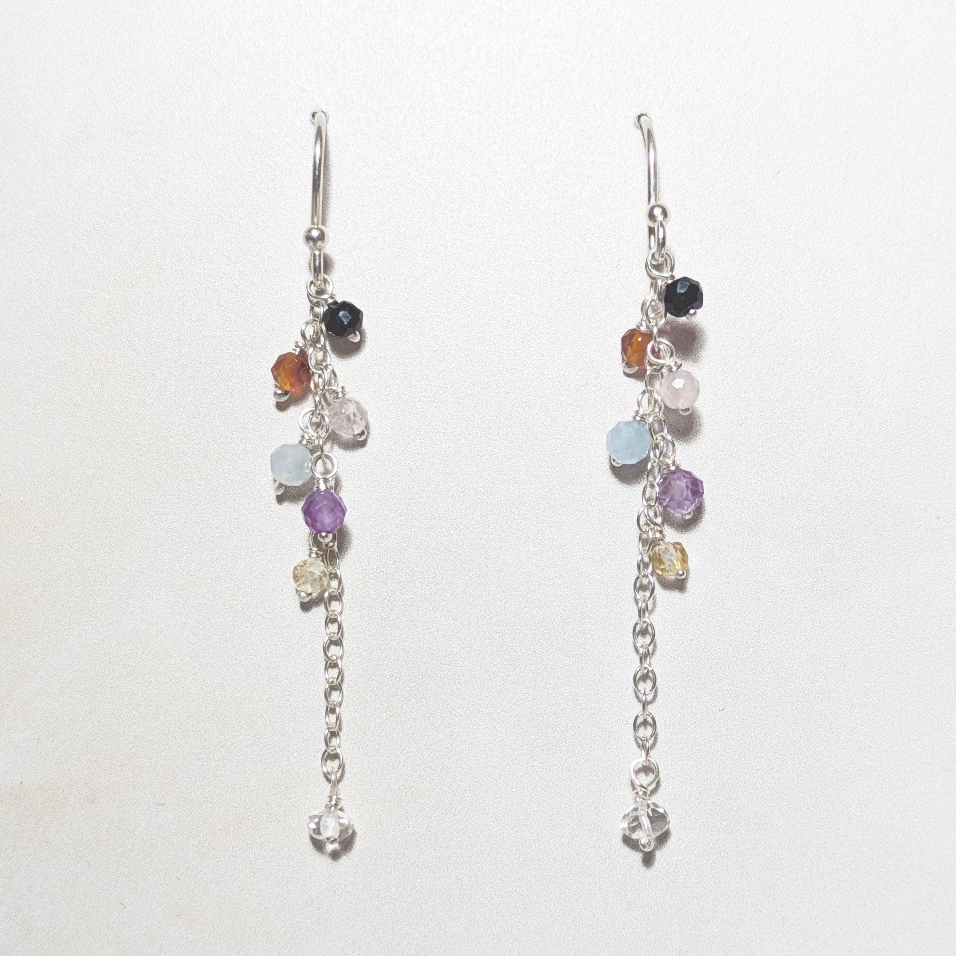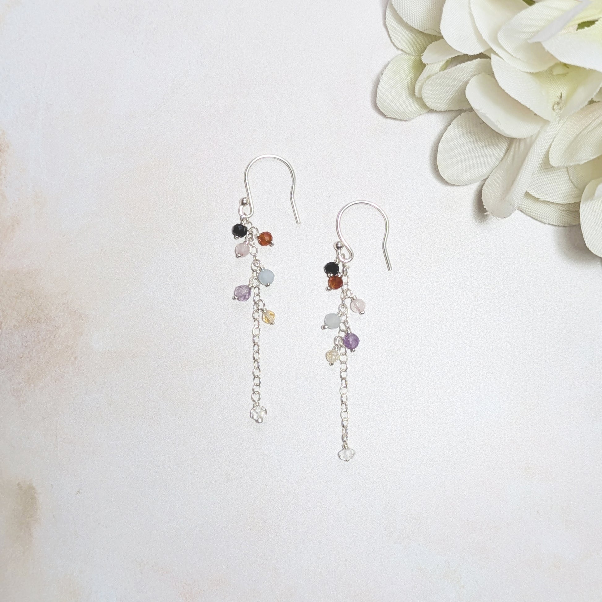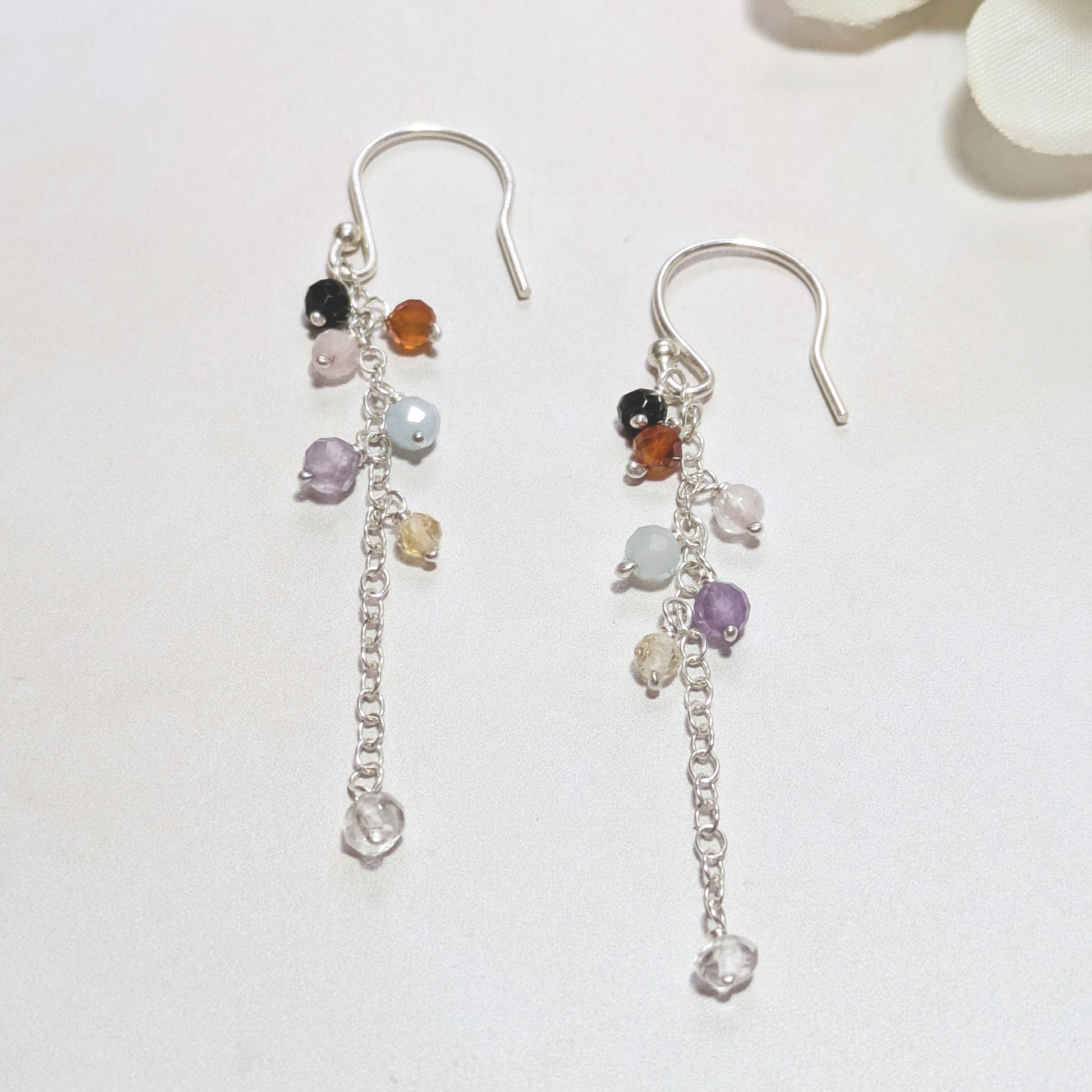 Meaningfully handmade in our studio our Seven Chakra Drop Earrings feature seven natural, ethically sourced gemstone charms suspended on chain, dangling from Sterling Silver ear hooks or studs, designed to help you balance mind, body, and spirit.